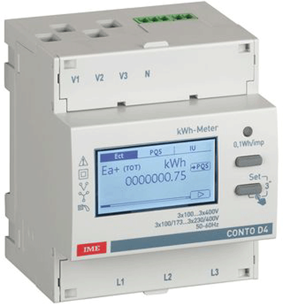 - Målinger: Total og nulstilbar energimåling i 2 kvadranter (kWh/kVArh), strøm (A), spænding (V), aktiv effekt (kW), reaktiv effekt (kVAR), tilsyneladende effekt (kVA), frekvens (Hz), cos phi og driftstimer.
