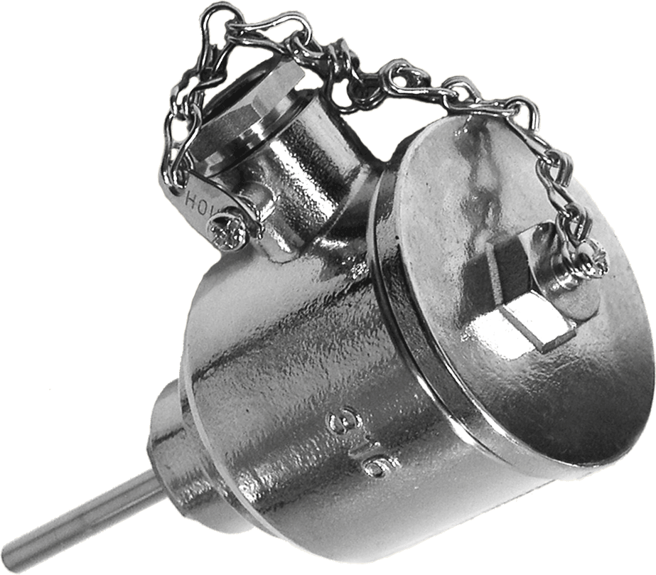 Temperaturføler med tilslutningshoved i poleret rustfri stål.